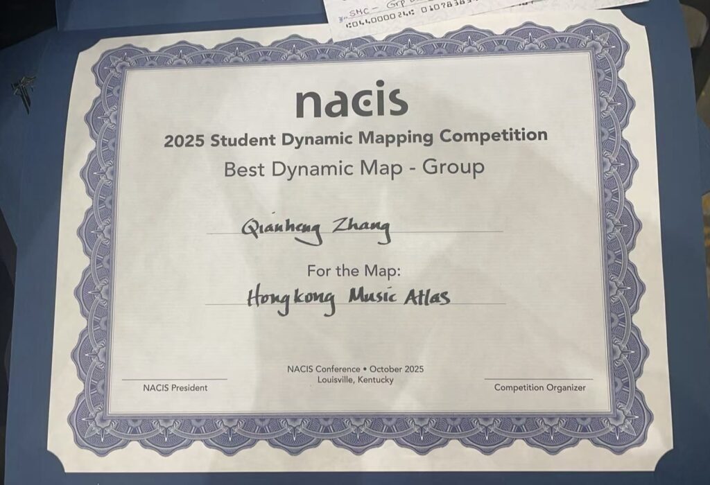 Congratulations to our lab member Qianheng ZHANG (together with Geography PhD student Yanbing Chen) jointly won the 27th Annual Student Dynamic Map Competition at the North American Cartographic Information Society (NACIS) 2025 annual conference.