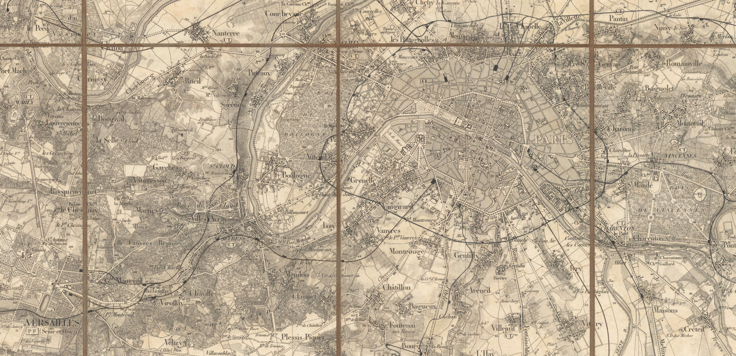 Figure 1. Detail from Paris, 1:80,000, sheet 48 of the carte de l’État-major (Paris: Service géographique de l’armée, 1832), with railroad lines added later in manuscript. Copper engraving, dissected onto cloth, 57 × 88 cm (entire).