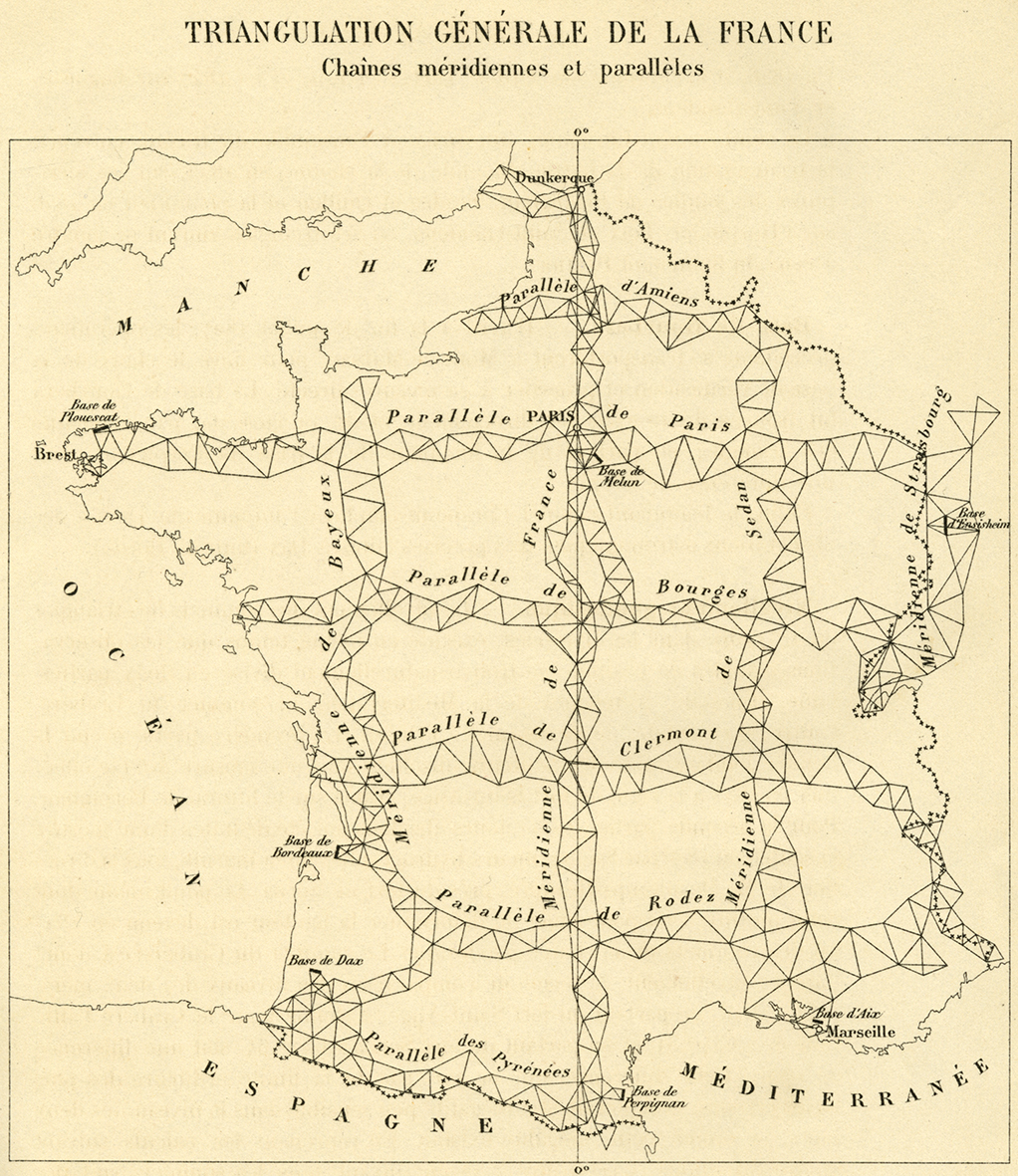 Figure 3. Triangulation générale de la France: Chaînes méridiennes et parallèles, in Henri-Marie-Auguste Berthaut, La carte de France, 1750–1898: Étude historique, 2 vols. (Paris: Imprimerie du service géographique de l’armée, 1898–99), vol. 2, following 24.