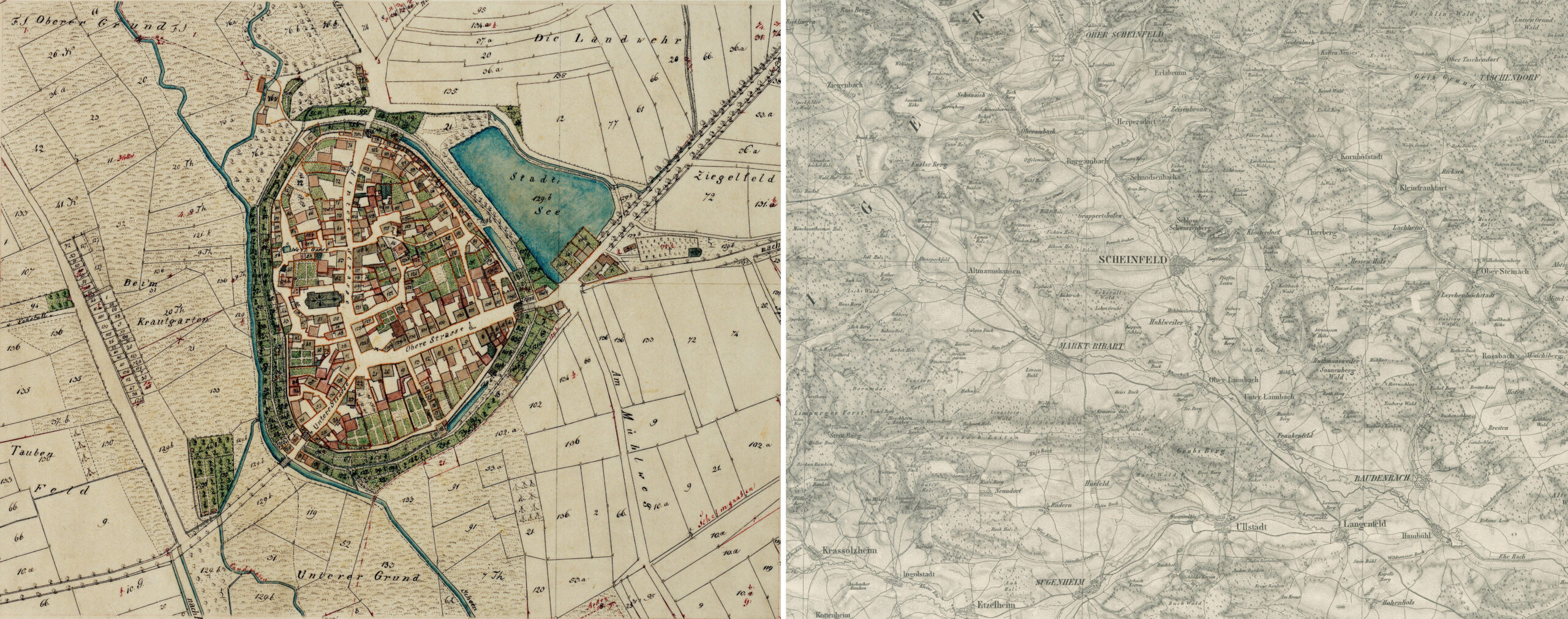 Right: detail from Friedrich Kappel and Otto Messerer, Scheinfeld, 1:50,000, from Topographischer Atlas vom Königreiche Baiern, sheet 27 (1855).