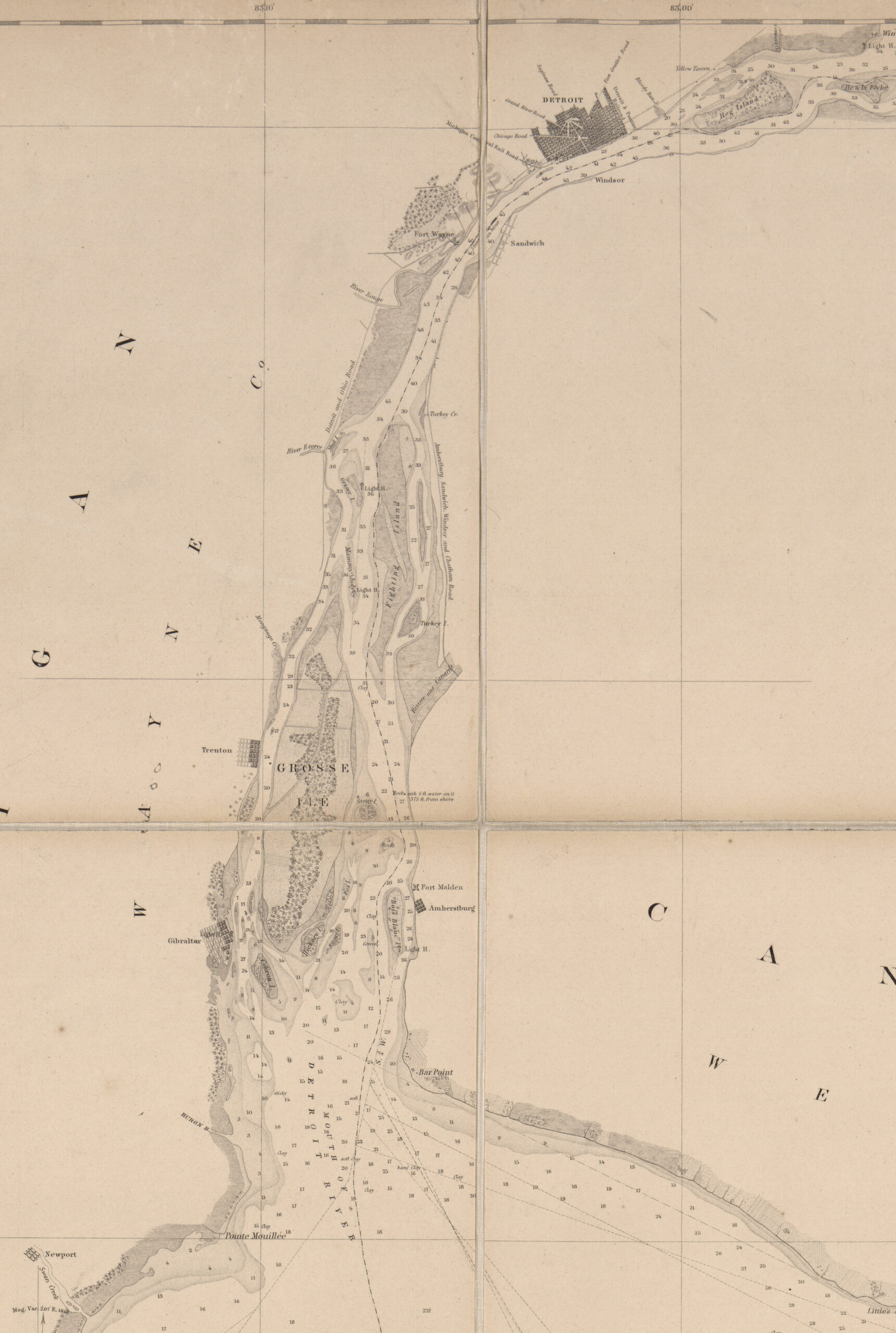 Figure 9. Detail of the Detroit River from West End of Lake Erie and Detroit River (Washington, D.C., 1849, updated to 1852), based on a local triangulation of the Detroit River by Lieutenant J. N. Macomb, topography by Macomb and other topographical engineers conducting the U.S. Lake Survey.
