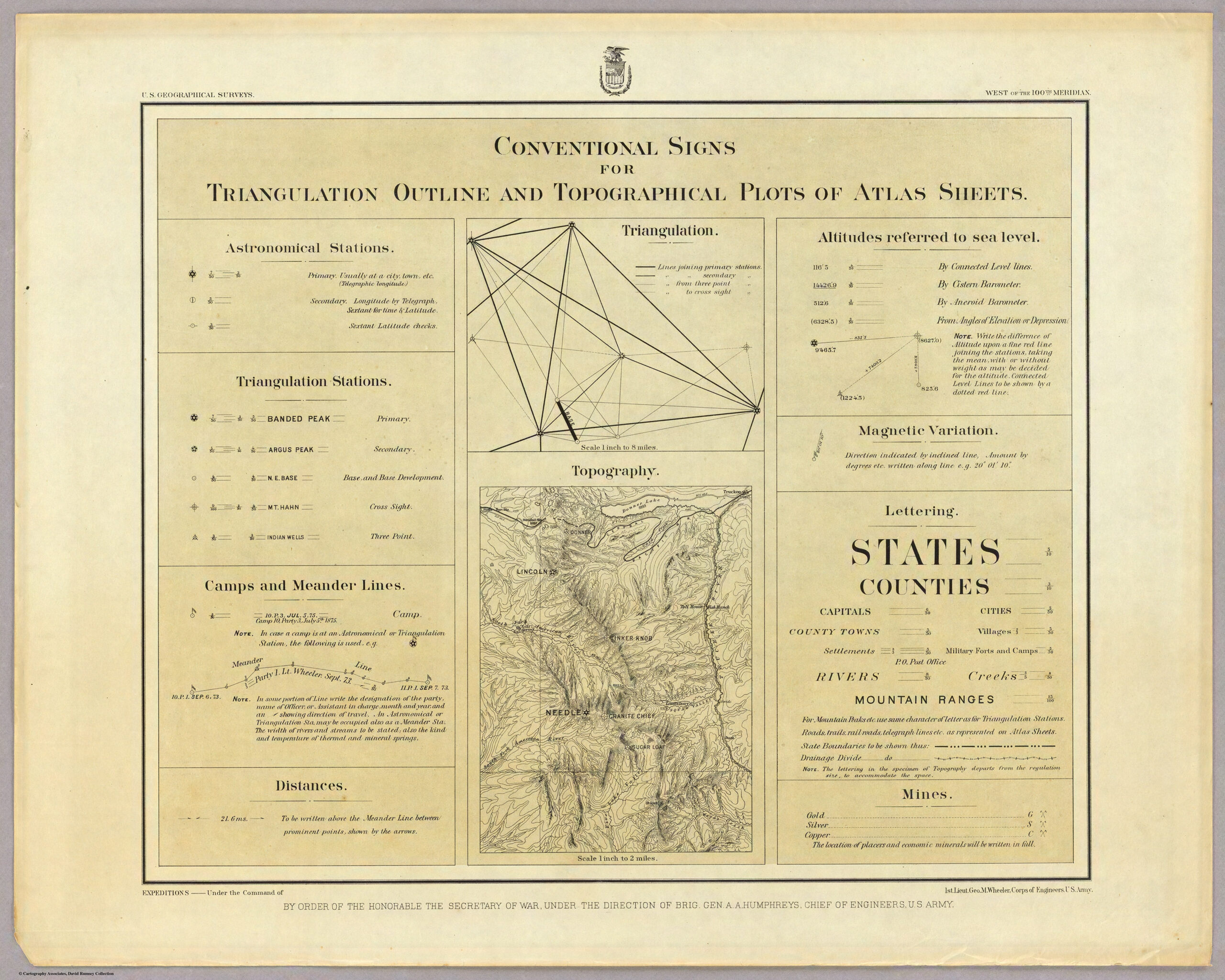 Similar problems plagued some of the supposedly systematic mapping in the United States. The high demand after 1825 for detailed and correct charts of the Great Lakes—as Americans settled their southern shores and used the lakes to ship out grain, meat, and ores and to ship in manufactured goods and foodstuffs—led Congress to authorize the U.S. Lake Survey, undertaken by the Corps of [Topographical] Engineers in 1841–82 (fig. 9). As I discuss in my entry on “Marine Mapping in the United States,” the Lake Survey undertook a careful, geodetic-quality triangulation, ostensibly to serve as the basis for its hydrographic work: however, the end of the survey came with the completion of the triangulation, which had not served as the foundation of any of the Lake Survey’s seventy-six published charts! In the 1870s, the federal government dispatched four expeditions to survey the lands, peoples, and resources of the territory that had been opened up by the completion of the Union Pacific Railroad in 1869, all of which were too rapid to have been based on comprehensive triangulations. That did not stop George M. Wheeler, the engineer in charge of the U.S. Geographical Survey West of the 100th Meridian, from issuing a sheet explaining some of the signs used for his topographical maps, a sheet which seemed to proclaim (incorrectly) that Wheeler’s survey had featured a foundation of triangulation (fig. 10).