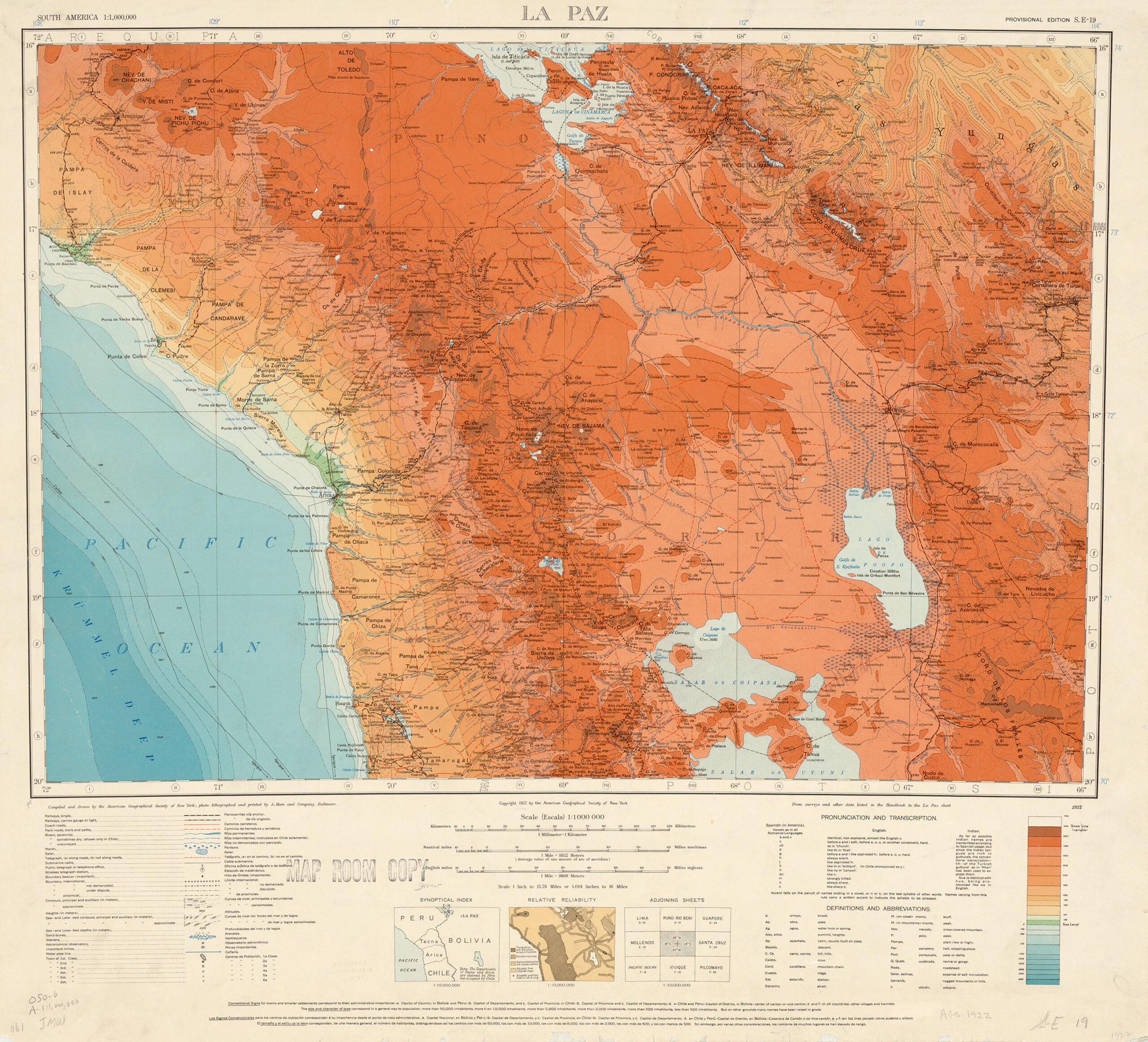 Figure 11. La Paz (Provisional Edition, S. E-19), 1:1,000,000 (New York, 1922), prepared and published by the American Geographical Society for its “Map of Hispanic America,” as a component of the International Map of the World.