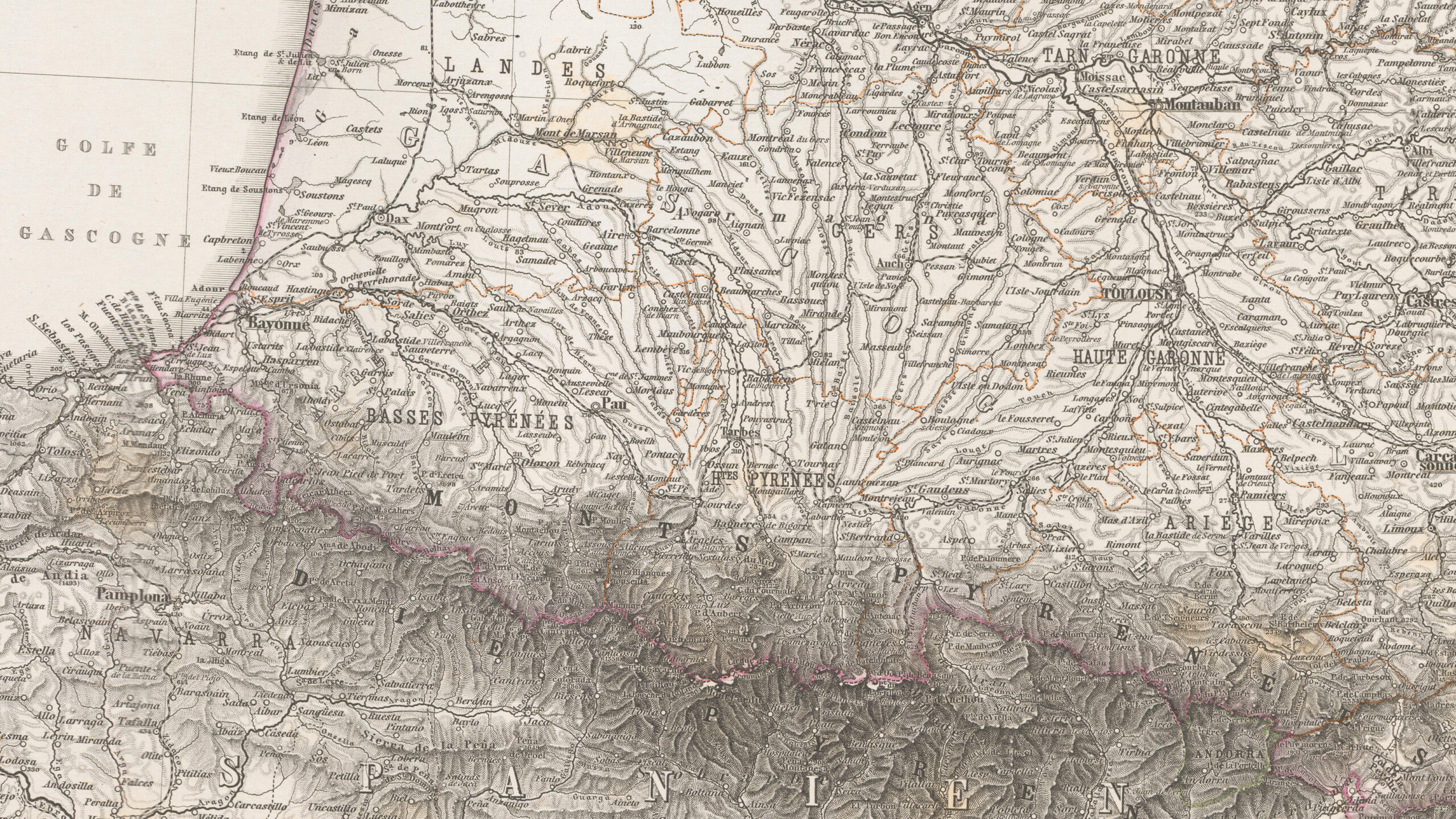 Figure 13. Detail from the southwest sheet of Carl Vogel, Frankreich in 4 Blättern, at 1:1,500,000 (Gotha: Justus Perthes, 1880), in Adolf Stieler’s Handatlas über alle Theile der Erde und über das Weltgebäude: 95 Karten (Gotha: Justus Perthes, 1882), map 36. This map was reduced from sheets of the carte de l’État-major at 1:80,000 (see fig. 1).