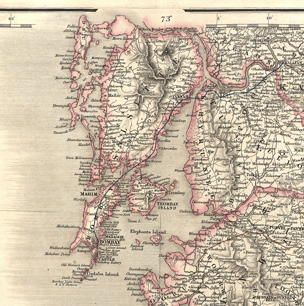 Figure 8. Detail from sheet 25 of the Atlas of India (London: John Walker, originally published 1854, this 1862 impression has added railroads), 1:253,440. Compiled from surveys by Major Thomas Best Jervis, Captain William Ashmead Tate, and others, in a two-volume collection of sheets of the atlas.